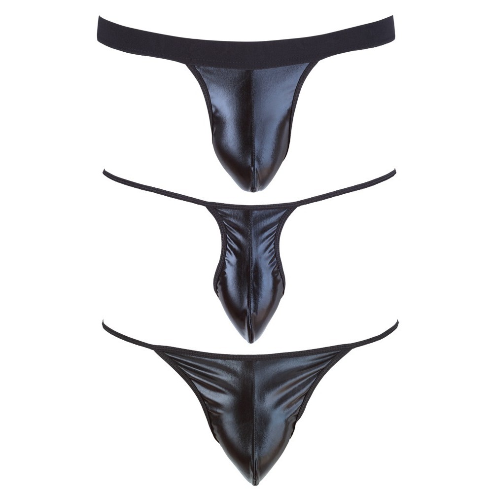 Es ist immer gut, diese drei Unterhosen in der Unterwäscheschublade zu haben: einen Mini-Tanga, einen Mini-G-String und einen Jockstrap. Alle sind aus schwarzem, elastischem Material gefertigt und haben eine glänzende Oberfläche mit Wet-Look-Effekt.
