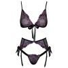 Das Set von Kissable besteht aus einem bügellosen BH, einem Strumpfgürtel und einem String und ist aus zartem schwarzem Powernet mit aufwendigen Blumenstickereien in Rosa und Lila gefertigt. Weich und elastisch, bietet es außergewöhnlichen Tragekomfort. Der BH verfügt über eine Satin-Schleife vorne und an jeder Seite, einen Hakenverschluss am Rücken und verstellbare Träger. Das Strumpfband hat einen Hakenverschluss am Rücken und verstellbare Strumpfbandhalter. Der kleine String ist dank seiner zwei dünnen, elastischen Bänder, die sich vorne vereinen, äußerst verführerisch.