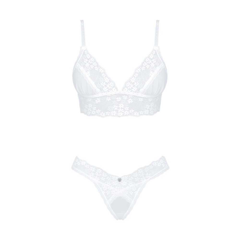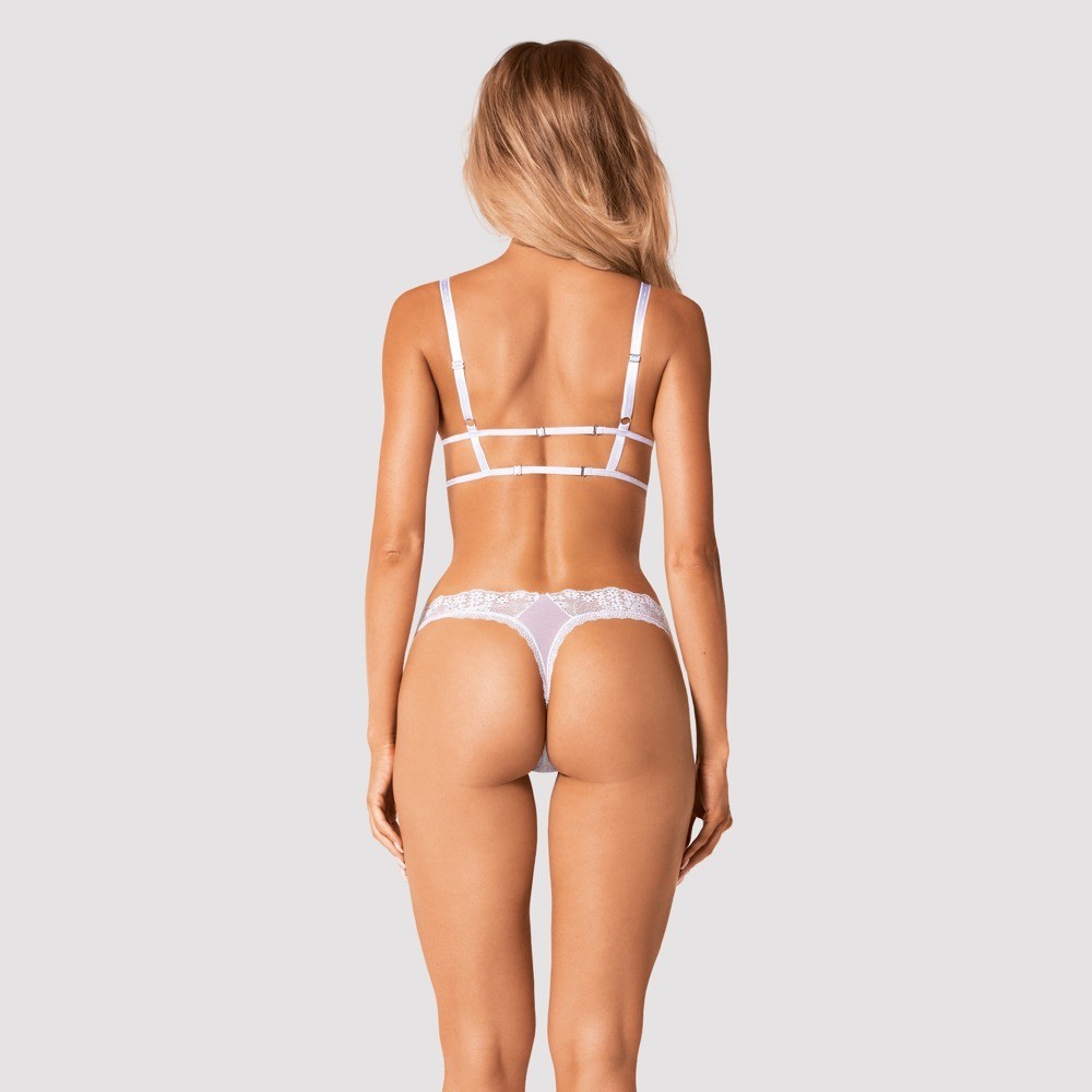 Der zum String passende BH betont sanft den Po und die Blumen-Spitze unterstreicht die weiblichen Kurven. Zusammen mit den halterlosen Strümpfen und den Spitzenhandschuhen aus derselben Kollektion entsteht ein äußerst sinnlicher Look.