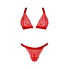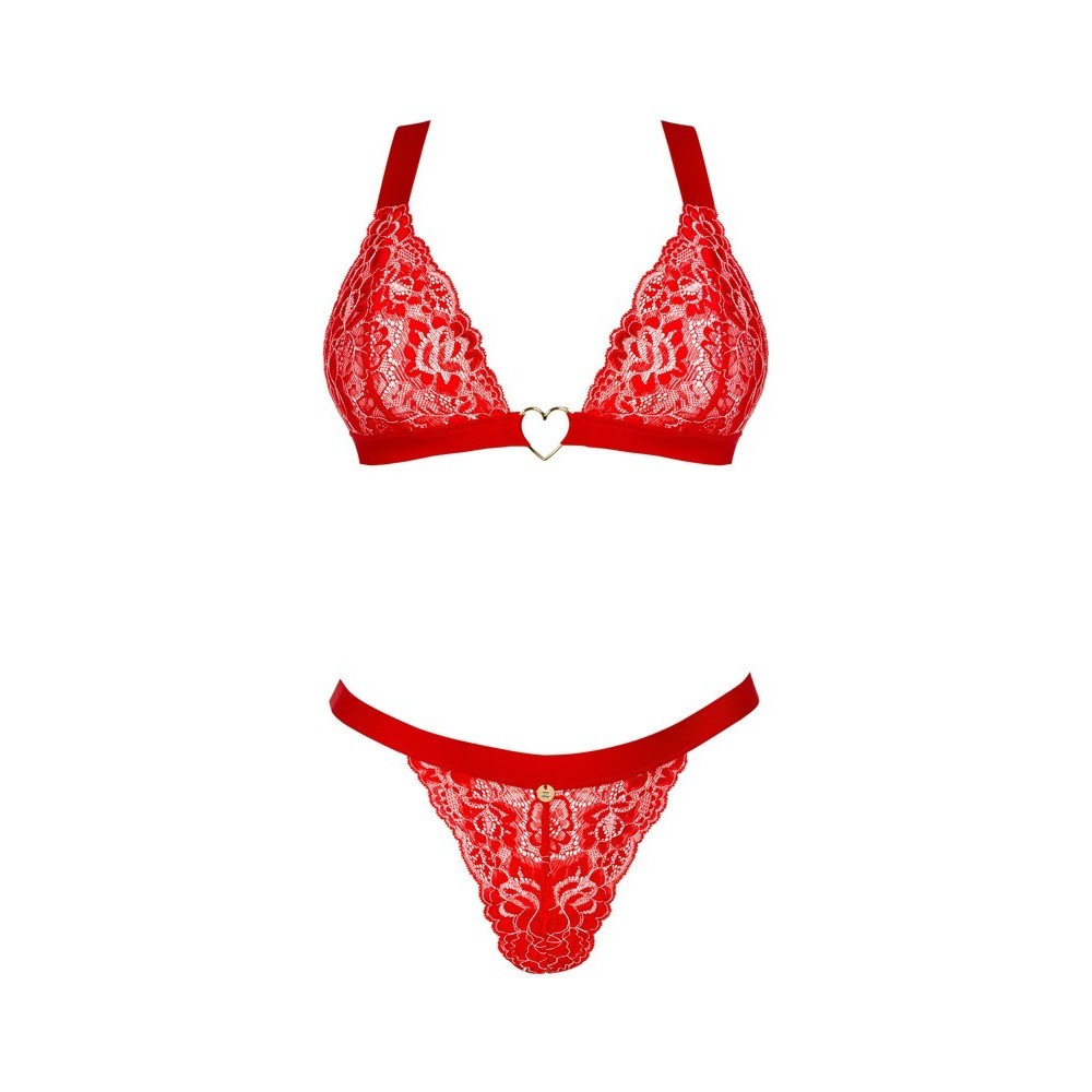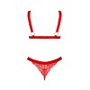 Rotes Dessous-Set Elianes von Obsessive mit weichem BH und String. Aus wunderschöner elastischer Blumenspitze und weichen Trägern mit goldenen Details. Weicher BH mit einem dekorativen Herz zwischen den Cups. Die bequemen breiten Träger und der Hakenverschluss am Rücken lassen sich individuell anpassen. Der Spitzen-Tanga verführt mit einem kleinen dekorativen Element auf der Vorderseite der Taille.