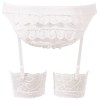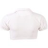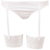 Kurzes, zu bindendes Oberteil, plissierter Minirock mit Ausschnitt hinten, der den Tanga mit Rüschen zeigt, verstellbare Strumpfhalter, Reißverschluss hinten.