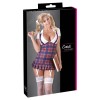 Schuluniformkleid mit weißem, kurzärmeligem Oberteil mit Ausschnitt, elegantem Kragen und blau-rot kariertem, plissiertem Rock mit Trägern, die sich am Rücken kreuzen, und Hosenträgern vorne.