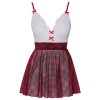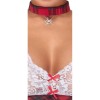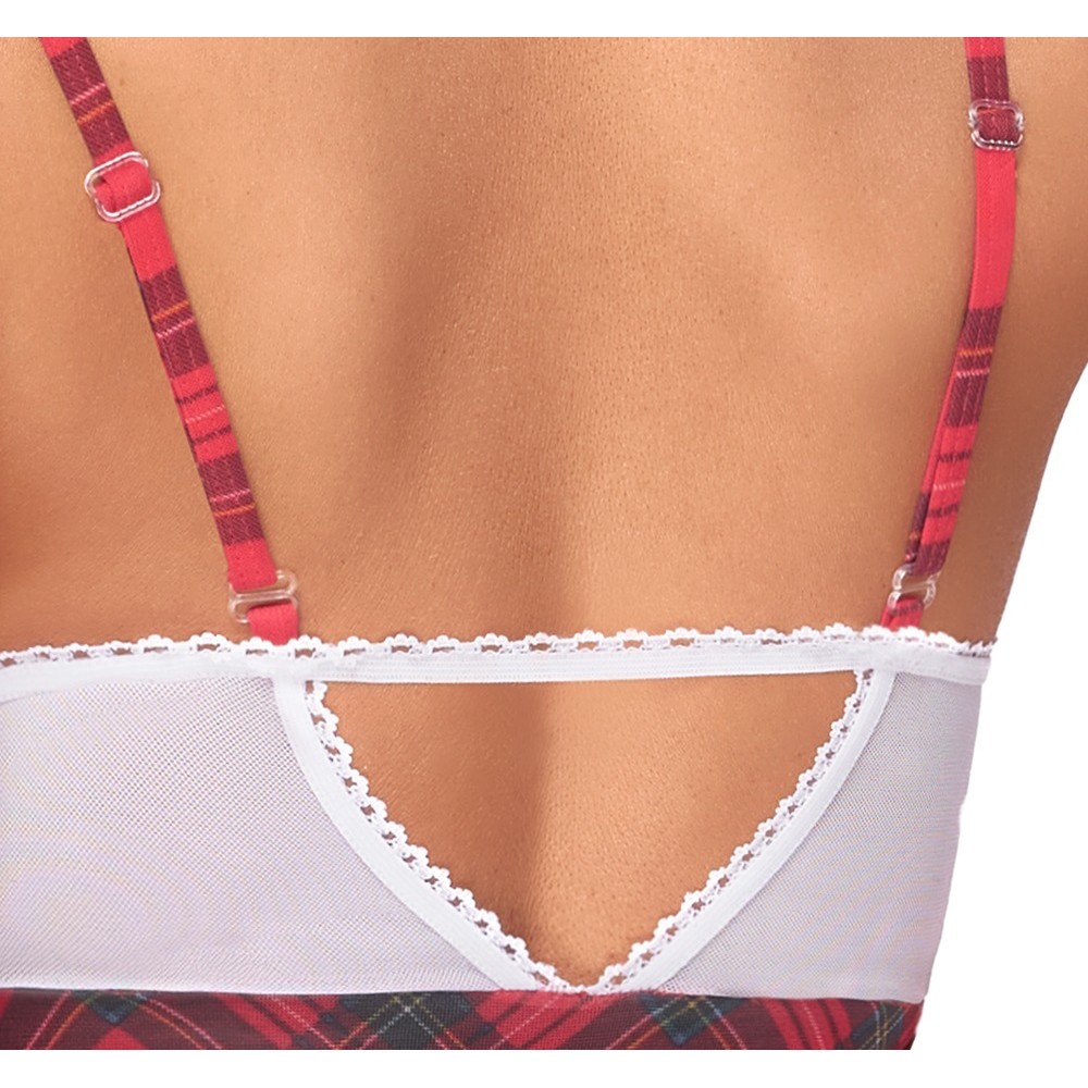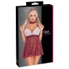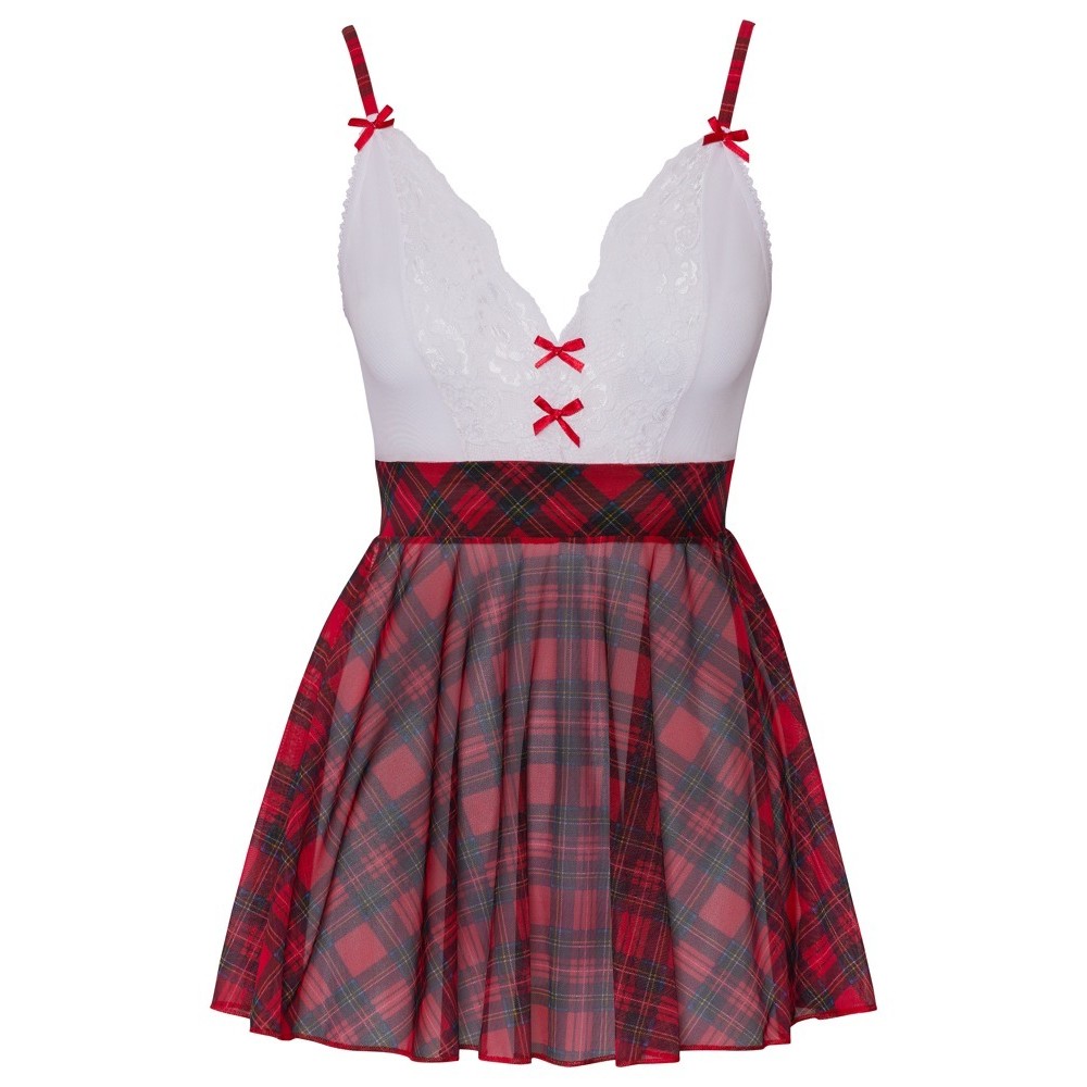 Schulmädchen-Kostüm von Cottelli COSTUMES, bestehend aus einem kurzen Kleid mit Trägern und passendem Halsband. Weißes Oberteil aus weichem Stoff mit zarter Spitze, verziert mit roten Schleifen. Die karierten Träger sind für eine perfekte Passform verstellbar. Der kurze, ausgestellte Rock mit Karomuster ist aus bequemem Strick gefertigt. Die karierte Halskette besticht durch einen herzförmigen Anhänger mit glitzernden Strasssteinen und einen verstellbaren Hakenverschluss im Nacken.