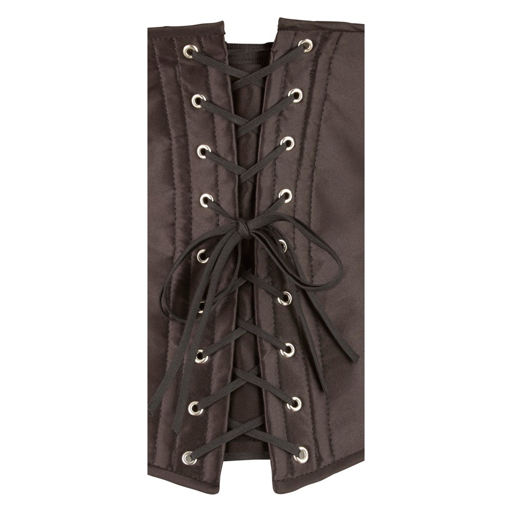 Klassisches schwarzes Korsett mit offenem Ausschnitt, Hakenverschluss vorne und verstellbarer Schleife hinten. Ideal für gewagte Spiele im Schlafzimmer oder für einen Abend in privaten Clubs.