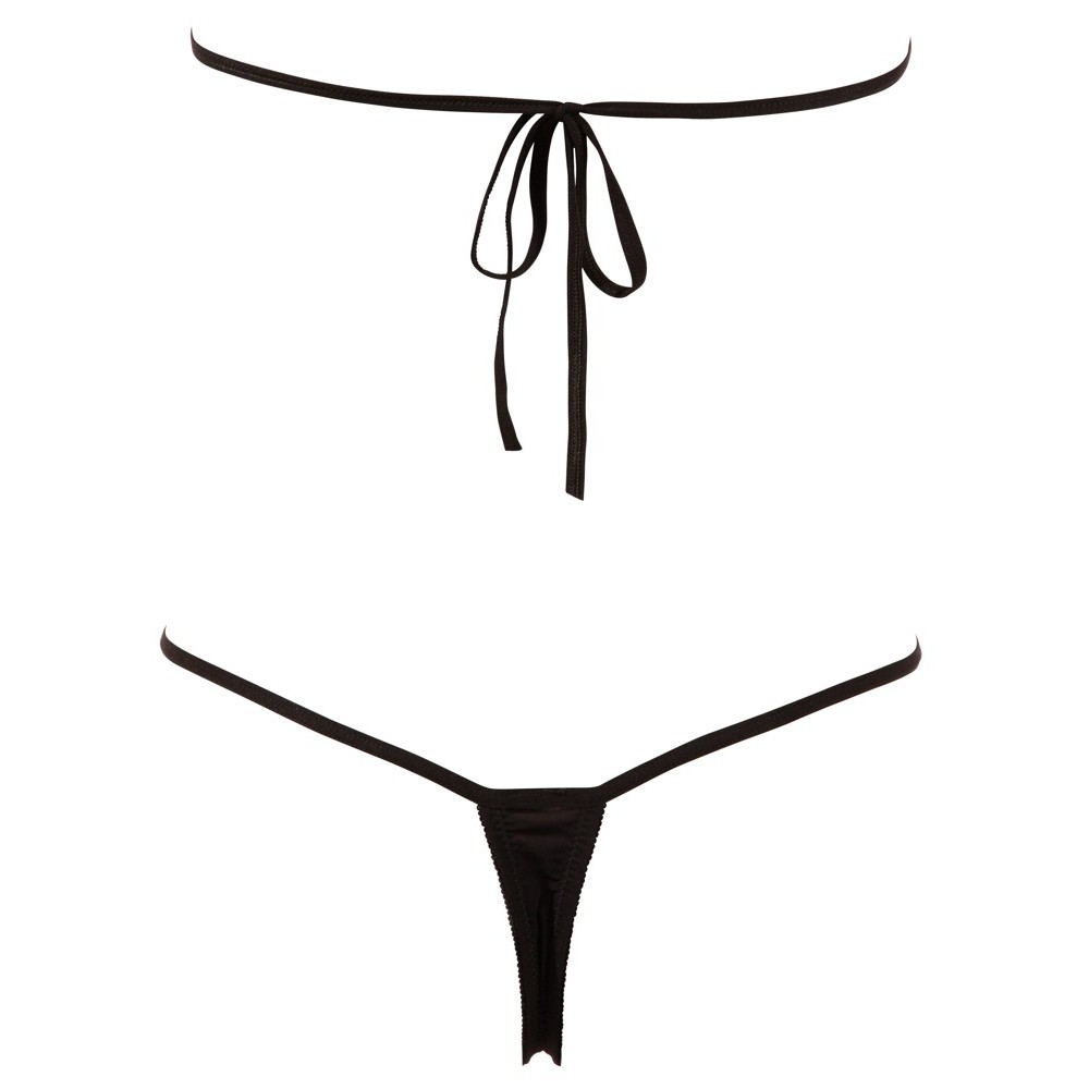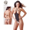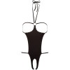 Sexy schwarzer Body mit verstellbarem Neckholder-Ausschnitt, der am Nacken gebunden wird und die Silhouette elegant betont. Die offenen Cups und der offene Schritt sind mit Strasssteinen verziert, was einen verführerischen und raffinierten Effekt erzeugt. Auf der Rückseite sind lediglich Träger zu sehen, wodurch der Rücken zur Geltung kommt und für einen noch gewagteren Look sorgt.