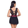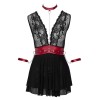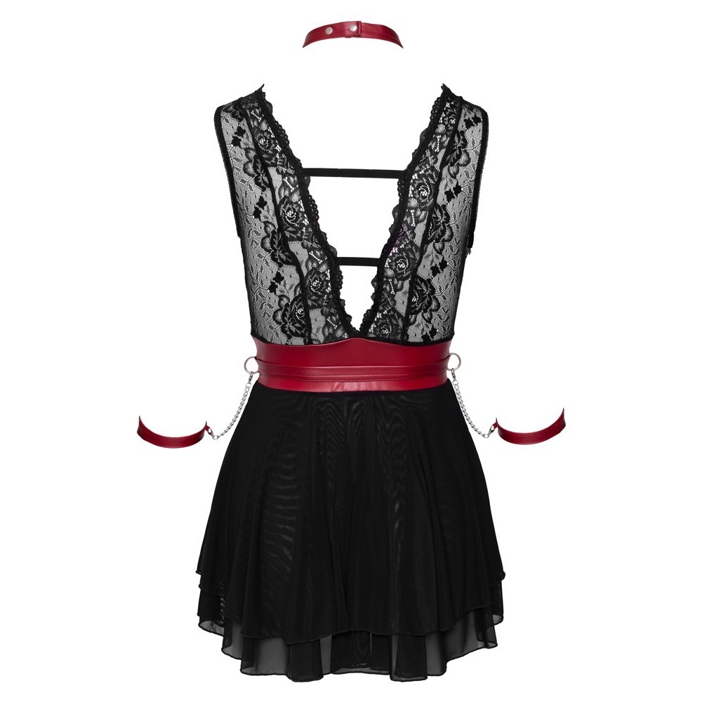 Set von Cottelli BONDAGE bestehend aus kurzem Nachthemd und Handschellen. Das Nachthemd ist im oberen Bereich aus zarter Spitze und im unteren Bereich aus leichtem, elegantem Stoff gefertigt und hat einen zweilagigen Rock mit einem kontrastierenden Einsatz aus mattem, rotem Material, der die Taille betont. Der Gürtel und der Kragen, ebenfalls aus mattrotem Material, verfügen über seitliche Ringe, an denen die Fesseln mit Ketten und Druckknöpfen befestigt werden können. Das Modell hat vorne und hinten einen tiefen Ausschnitt, der einen provokanten Look erzeugt. Die mitgelieferte Kette kann mit Druckknöpfen am Kragen befestigt werden, der außerdem einen dekorativen Ring an der Vorderseite hat. Die Bänder mit Haken- und Ösenverschlüssen und der Gürtel sind verstellbar und können vollständig entfernt werden.