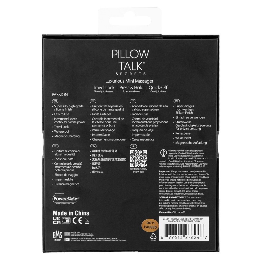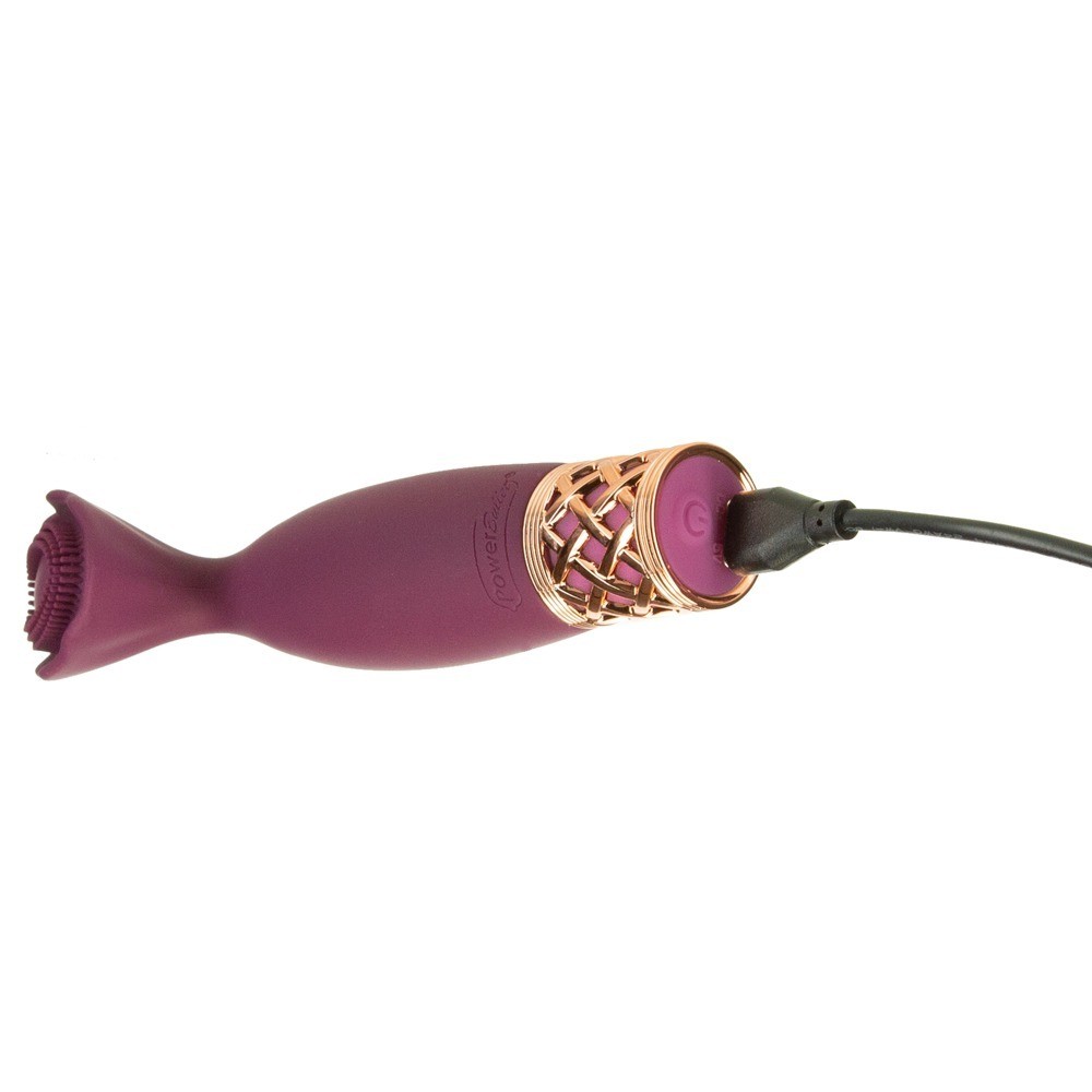 El Passion de Pillow Talk Secrets es un vibrador para colocar sobre la cama para quienes anhelan un masaje sensual y estimulante. Acabado en un seductor color púrpura y acentuado con detalles dorados, aporta un toque de auténtico lujo al dormitorio. Las suaves protuberancias enmarcan el cabezal flexible en forma de pétalo y permiten un agarre y control perfectos. La vibración de ajuste continuo puede regularse fácilmente en la base del vibrador.