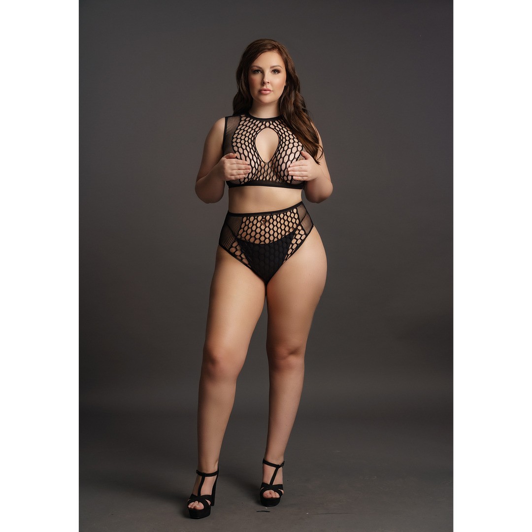 Two-piece set consisting of a crop top and high-waisted thong in fishing net and fence net with teardrop detailing. With some elasticity, it fits sizes XL to 4XL. Thong not included.