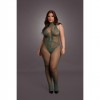 Bodystocking with a combination of lace-pattern and fishnet. This style has a halter neck and open crotch. This bodystocking has a lot of stretch and can be worn from size XL to 4XL.