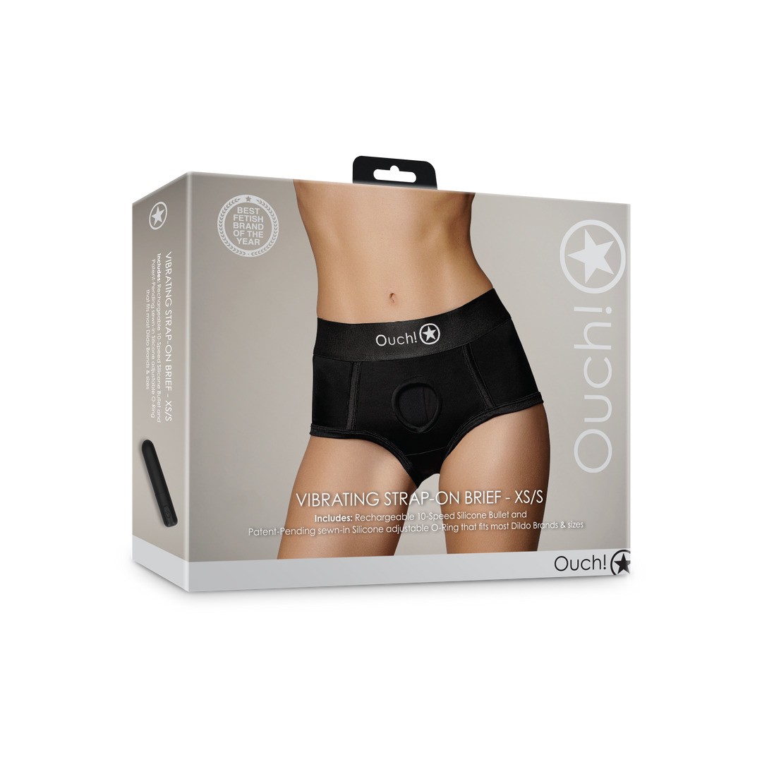 The Vibrating Strap-on Brief has a mid-rise fuller cut fit. Simple yet elegant, these strap-on panties are perfect for you and your partner. Don't worry about complicated straps and buckles, just slip them on, add the toy and enjoy.   With a variety of styles, shapes sizes, everyone will find their perfect fit. With the unique O-Ring System, almost all dildos and dongs will fit into this strap-on panty without the need of additional O-Rings. Each panty comes with a premium quality silicone rechargeable 10-speed vibrating bullet for extra sensations for you and your partner. Made of high-quality elastic compression material for a better fit, comfort performance. The lightweight breathable fabric will draw away moisture from the body ensuring that when things get hot, you stay cool. Perfect for Packing, Pegging Penetration.  Available in 3 sizes:  XS/S, M/L, XL/XXL. 1-year warranty. Pairs perfectly with All Ouch! RealRock Dildoâs Dongs.