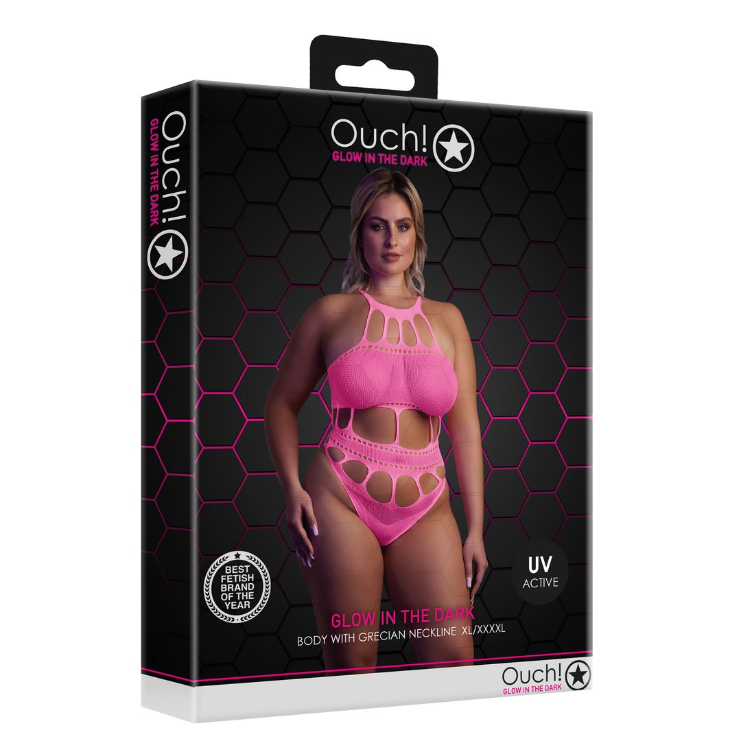 Our Neon lingerie is the perfect addition to your collection. Made with comfortable, easytofit, stretchy materials they are designed to fit your body perfectly. Whether you're using them as party wear or as lingerie, this eye-catching piece will make sure you stand out! Unleash your inner goddess with this stunning UV activated lingerie. The Grecian neckline gives it that wow-factor and makes you stand out. The lines on the OUCH! Body with Grecian Neckline accentuate your body with the waistband highlighting your waistline. The UV activated materials adds a touch of mystery and allure. Easy to fit because of the stretchy materials will make you light up the night. Available in neon pink and neon green. Sizes run from XS/ XL to XL/XXXXL