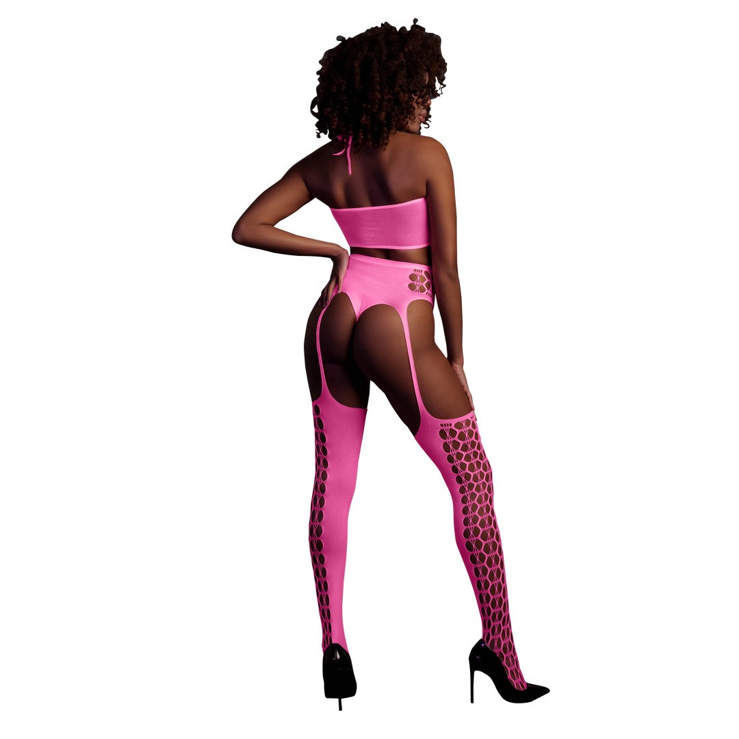 Vibrant Crop Top: The Neon Two-Piece with Crop Top and Stockings is a vibrant ensemble that includes a striking crop top, adding a bold and playful element to your wardrobe.Matching Stockings: Coordinated with matching stockings, this two-piece set creates a cohesive and eye-catching look, making it ideal for both party wear and intimate moments.Comfortable Stretch: Crafted with comfortable, easy-to-fit, stretchy materials, this ensemble ensures a snug and flattering fit. Choose from neon pink or neon green to make a statement and light up the night with UV-activated allure./