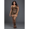 Knitted floral laceAdjustable halter tiesAttached stockingsAccentuates the female figureSoft and stretchy/
