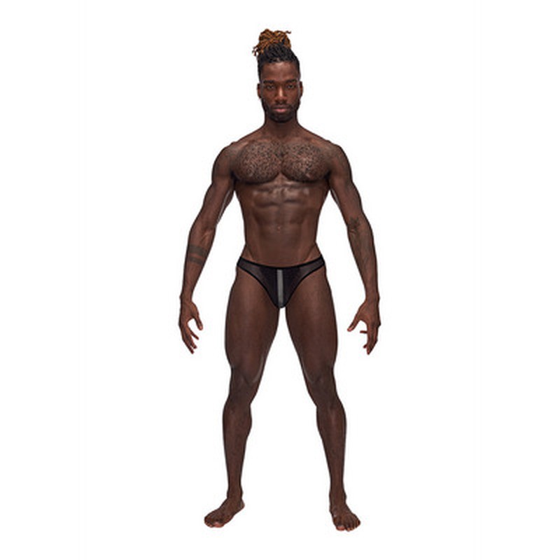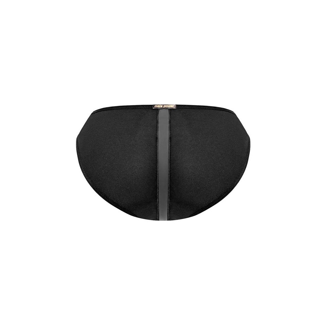 From the Landing Strip collection by Male Power, the Bikini Brief, features thin plush elastic trim on waist and legs, tone on tone matt onyx insert strip through the pouch and rear and a decorative metallic brand label on rear waistband.