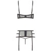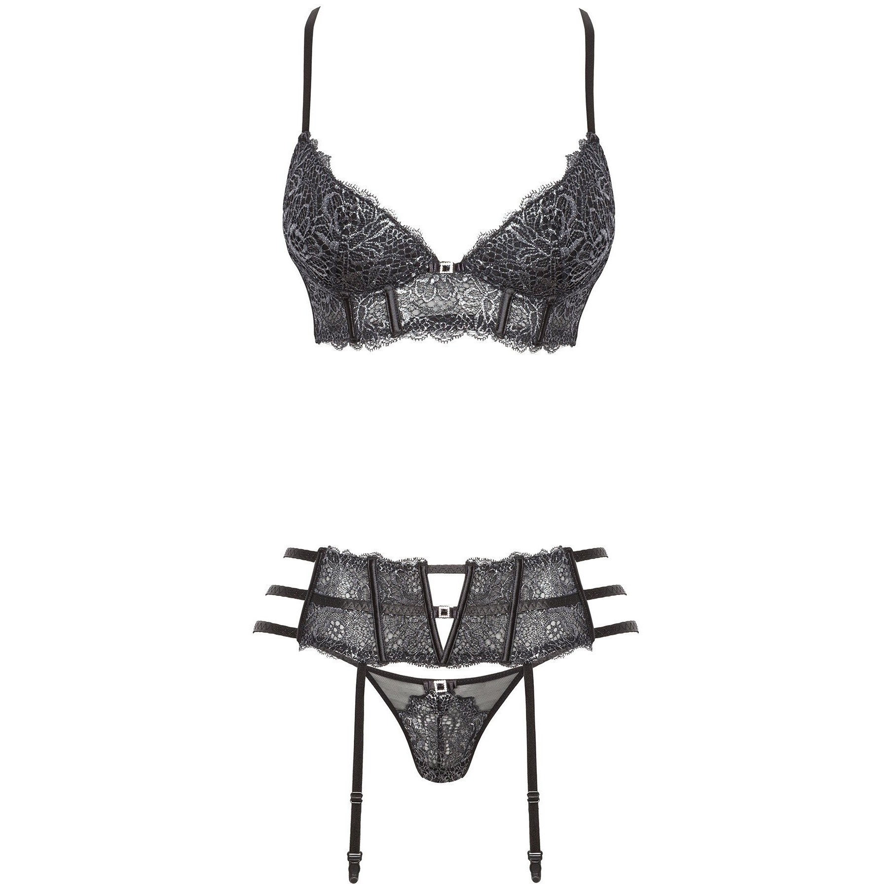 Conjunto de tres piezas compuesto por sujetador, liguero y tanga. La parte delantera es de precioso encaje con un brillo metálico plateado, mientras que la trasera es de delicada malla. Copas push-up con aros cortos debajo. El conjunto está adornado con tres bonitos broches con cristales.