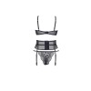 Clásico, pero a la vez muy sexy conjunto de ropa interior negro de tres piezas. Sujetador abierto de encaje y tul con aros. Un llamativo liguero sujeto con corchetes.