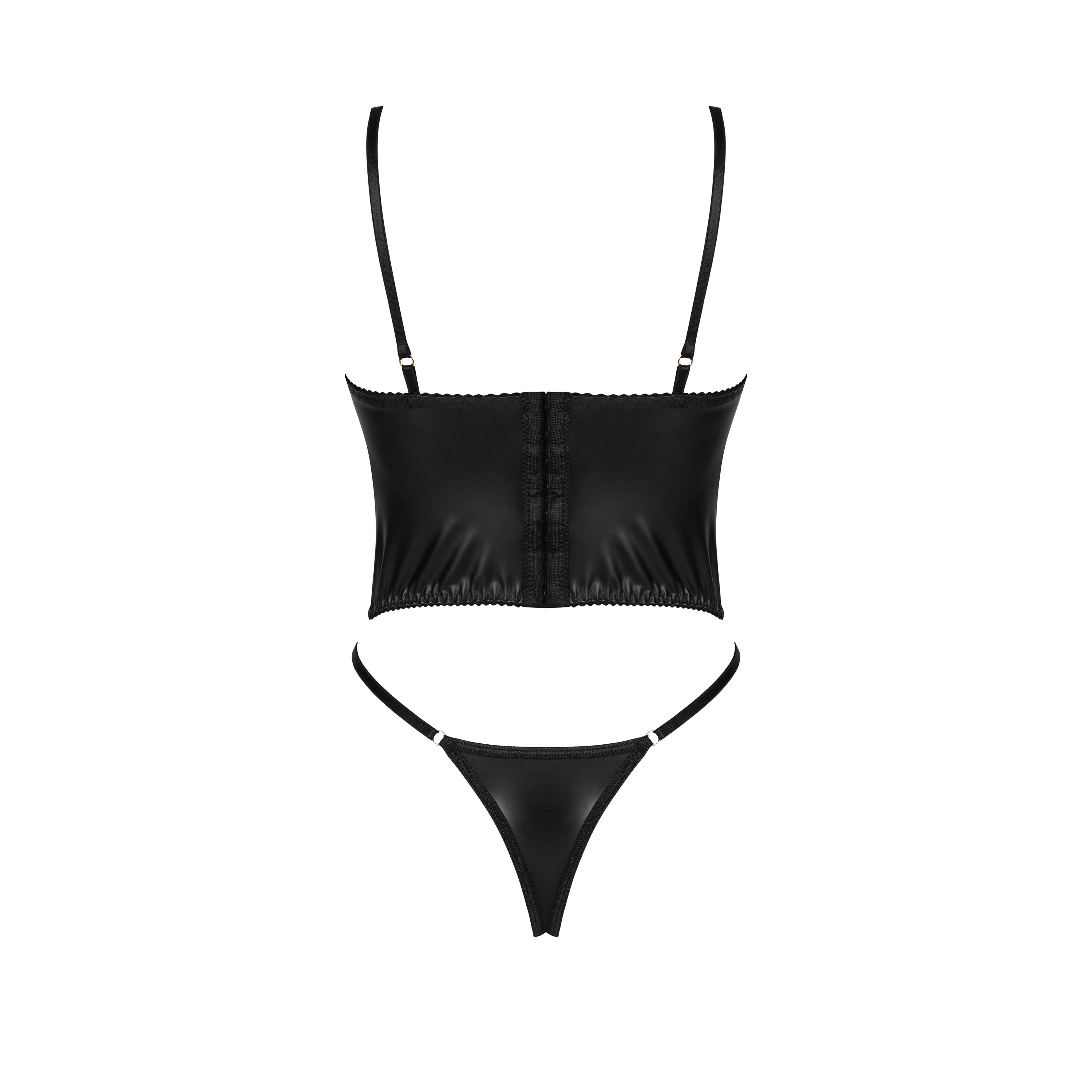 Un conjunto sexy confeccionado en ecopiel de color negro, perfecto para las mujeres que desean resaltar su confianza y su estilo único. El top corto - corsé con copas con aros proporciona una excelente sujeción del busto, y el cordón decorativo de la parte delantera añade un toque feroz al conjunto.