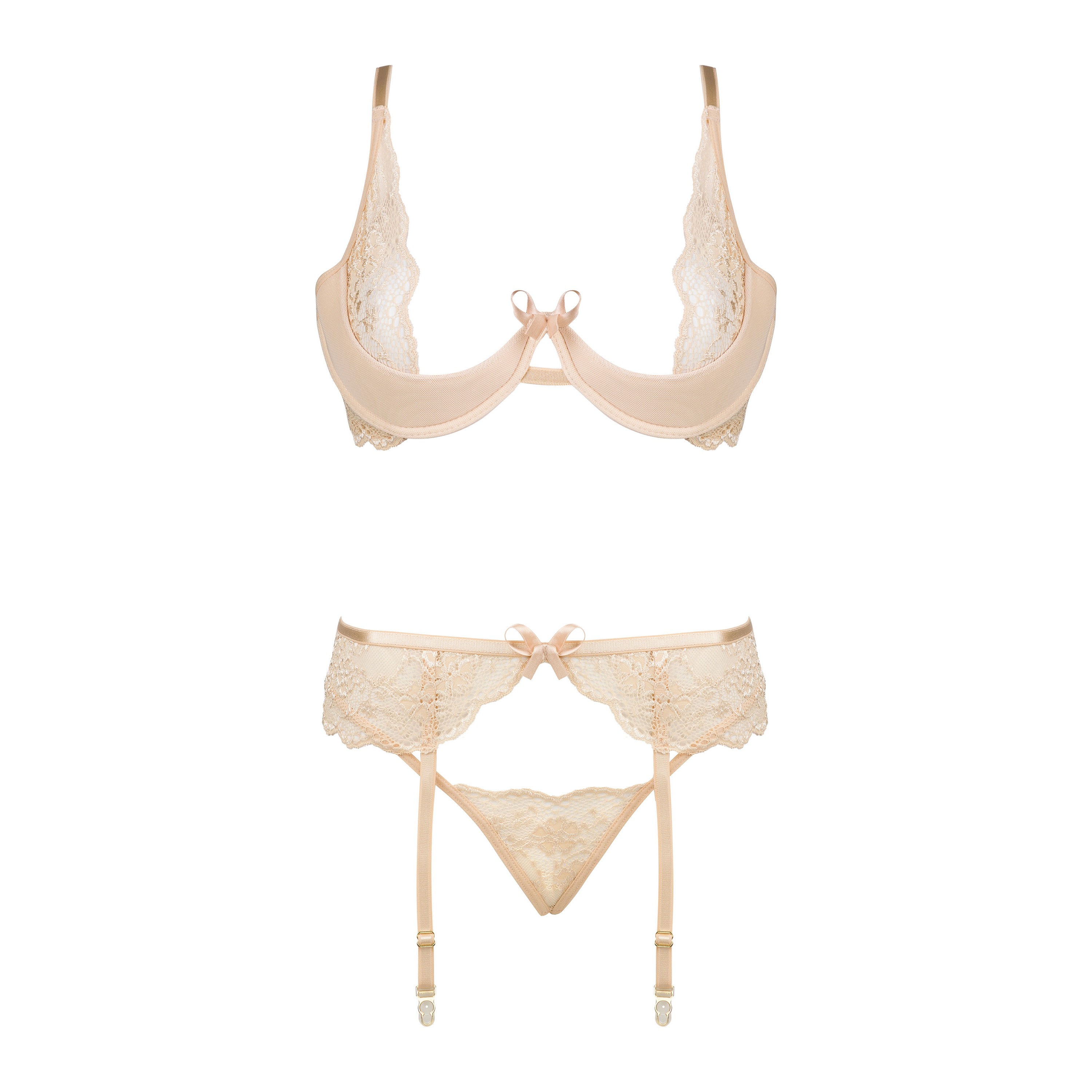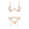 Conjunto de lencería clásica en color nude, compuesto por sujetador, braguitas y liguero.