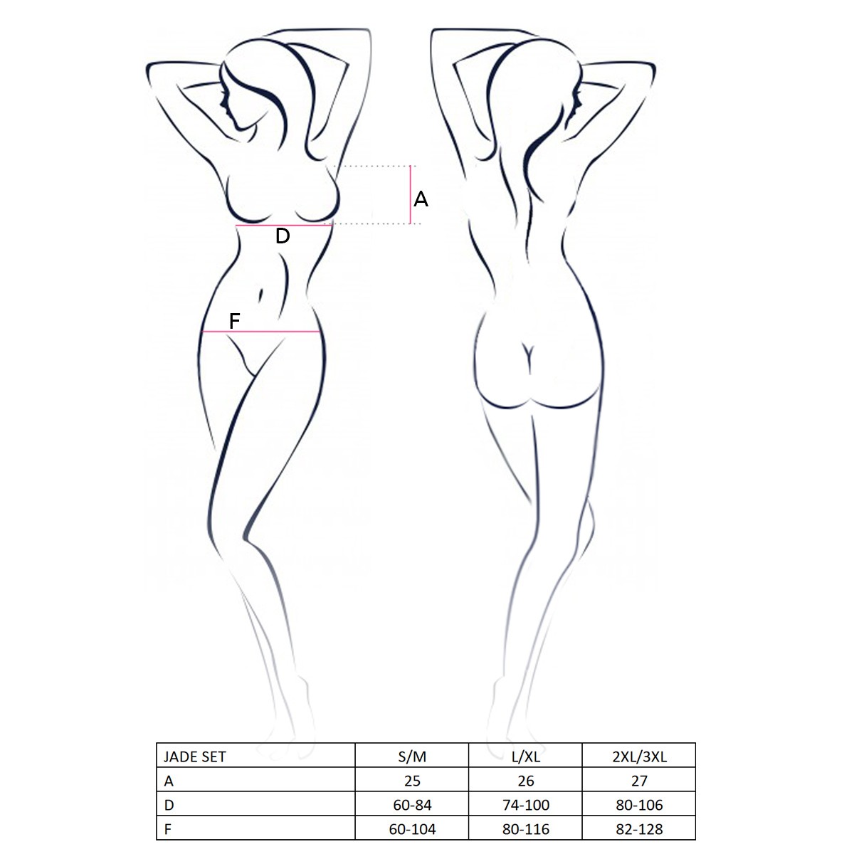 El conjunto Jade de PASSION combina tejido de encaje y plisado con sujetador y tanga de talle alto, realzado por tirantes y encaje en la espalda, ofreciendo sensualidad y elegancia. Ideal para quienes buscan lencería sofisticada y sexy.