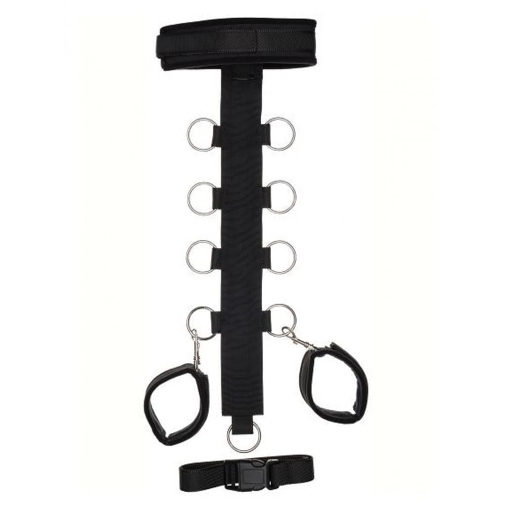 Das T-förmige Design ist über robuste Karabinerhaken mit zwei ebenfalls verstellbaren Handschellen verbunden, was einen festen und sicheren Halt gewährleistet. Die Handschellen können abgenommen oder neu positioniert werden, was eine vielseitige Verwendung ermöglicht.