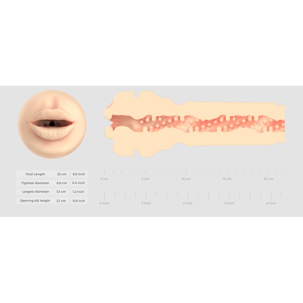 El masturbador Feel Stroker Mouth de Kiiroo, fácil de sujetar, tiene forma de boca realista con labios suaves. Con una excitante textura interior para un intenso masaje del pene. La funda interior es de material Superskin suave como la piel y puede extraerse fácilmente de la funda para su limpieza. 22,5 cm de largo, exterior Ø 5,8-8,4 cm, interior Ø 0,9 cm-3,1 cm (flexible). Peso 542. ABS, TPE.