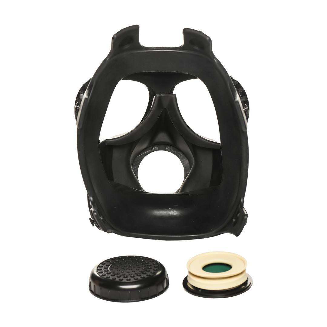 Materiales: Máscara: silicona, metal, plástico. Manguera: goma, metal, tela. Frasco: plástico.