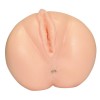 Skin-coloured masturbator shaped like a vagina and anus, with stimulating internal grooves and elastic pleasure holes.