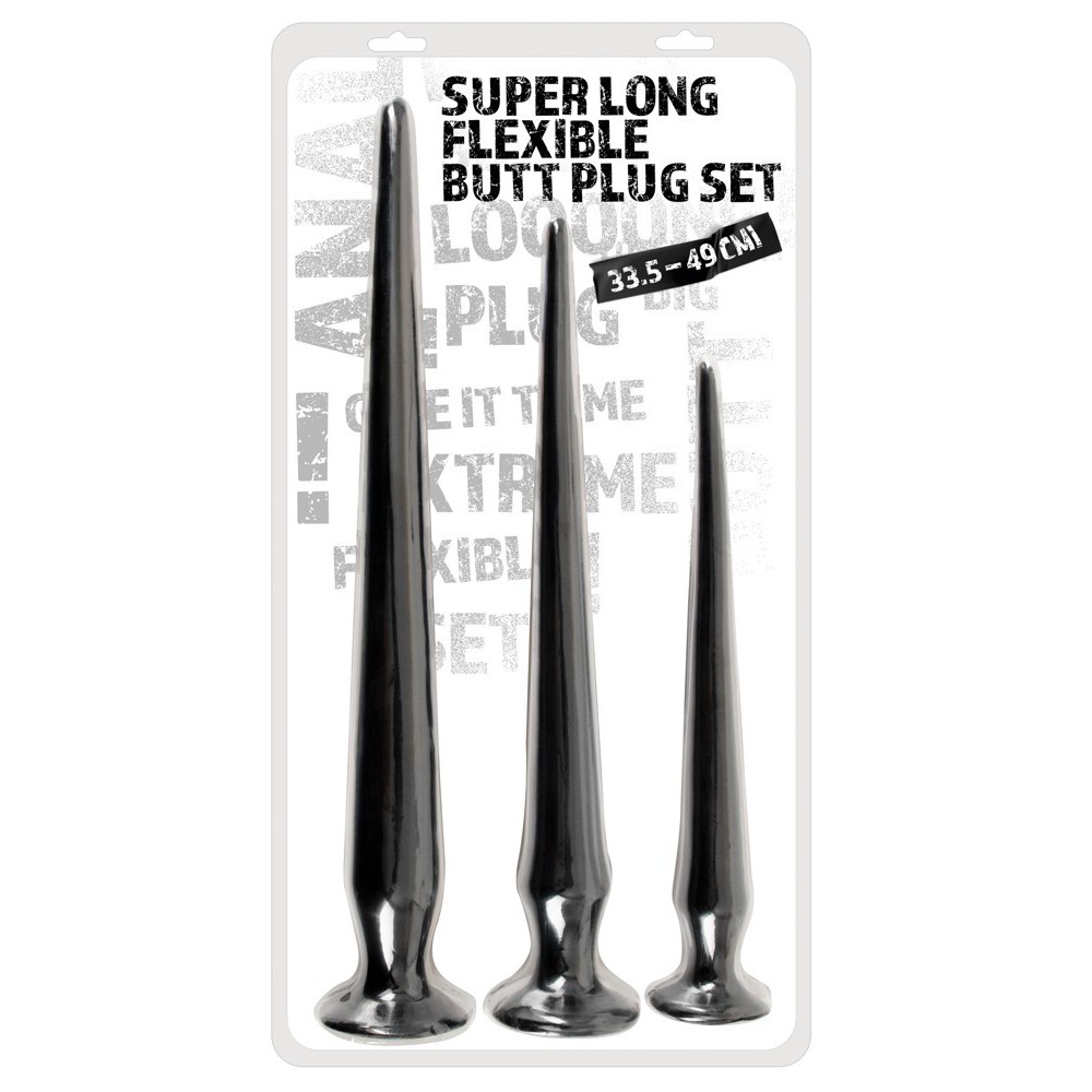 Super Long Flexible Butt Plug Set from You2Toys: set with 3 very long anal plugs, of different sizes and weights. Each plug is extremely flexible and features a soft cone-shaped tip and a suction cup that acts as a stopper.