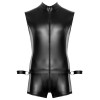 A sleeveless jumpsuit with two cuffs included, from Svenjoyment BONDAGE. The elegant matt black design hugs the body perfectly, whilst the mesh inserts on the short legs add an exciting visual touch. The front features a zip that runs from the high neck to the waist, and the pocket includes an additional zip. On each side of the waistband there is a ring for attaching the included cuffs, which are adjustable with hook-and-loop fasteners for added comfort. At the back, six additional rings offer even more possibilities for use.