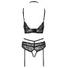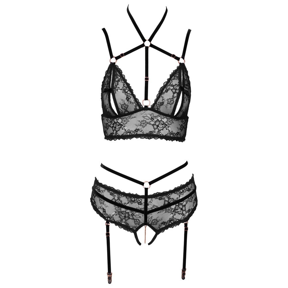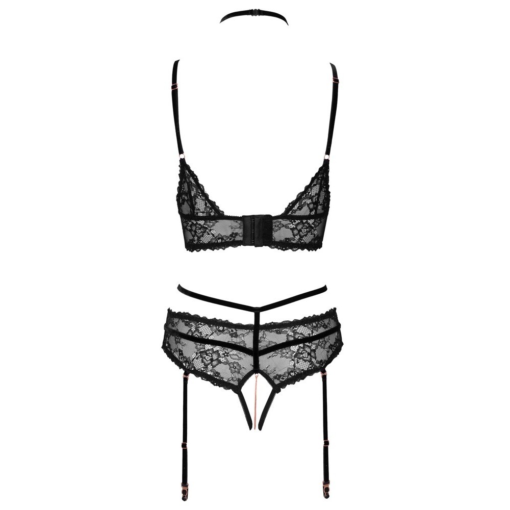 Set consisting of a bra and thong with suspenders, without crotch, by Abierta Fina. Delicate lace and extremely soft velvet combine in an exciting design, enriched with rose gold metallic elements and sparkling rhinestone rings. The bra features slits in the cups, velvet straps at the neckline and a hook fastening at the back. The thong with suspenders, without a crotch, includes a removable stimulating chain over the crotch area. The elastic straps, suspender straps and neckline straps are made of velvet and are adjustable for a perfect fit — the suspender straps are also removable.