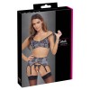 Soft bra, garter belt and crotchless thong set from Cottelli LINGERIE. All 3 pieces of black lingerie with white fronts covered in fine black lace. The soft, stretchy material makes them very comfortable to wear. The silver metal details complete the elegant look. The bra and suspender belt have a zip fastening at the front and a hook fastening at the back. The straps and 6 suspender straps are adjustable. The thong seduces with its completely exposed crotch.