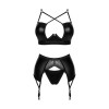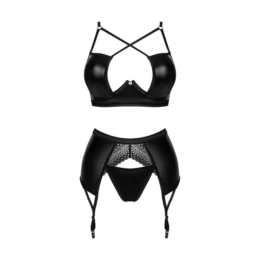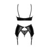Three-piece Norides set by Obsessive, consisting of an underwired bra, suspender belt and thong, in soft, stretchy fabric with a wet look. The bra has a sophisticated cut with an extravagant neckline and adjustable straps, as well as a hook fastening at the back for a perfect fit. The suspender belt includes a lace insert at the front and a hook fastening at the back with adjustable straps. The wet-look briefs seduce with a delicate lace triangle at the back.