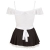 White lace top with thin adjustable straps and sleeves that can be worn off the shoulders. Slightly flared opaque black skirt with visible white lace details and apron included to complete the seductive look.