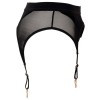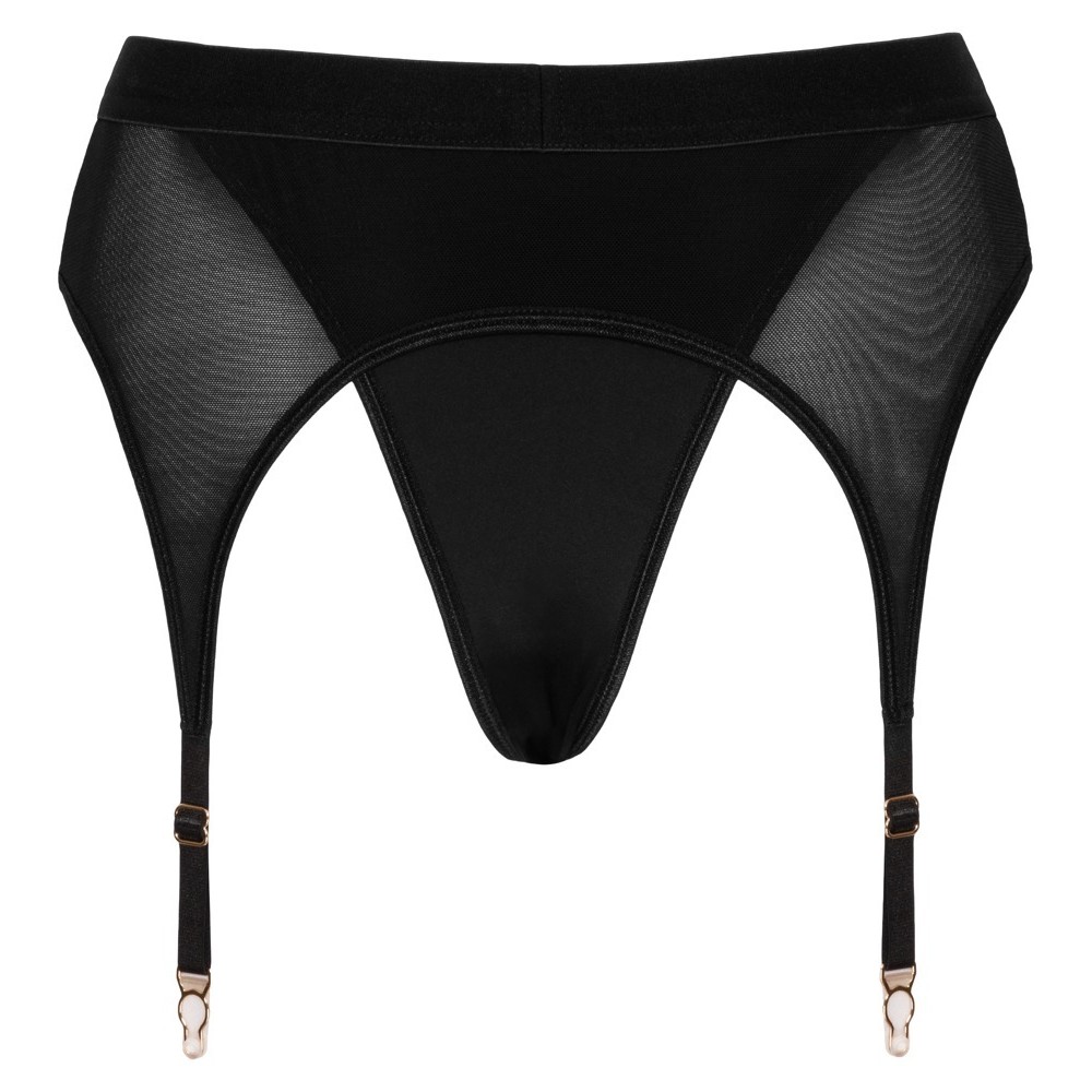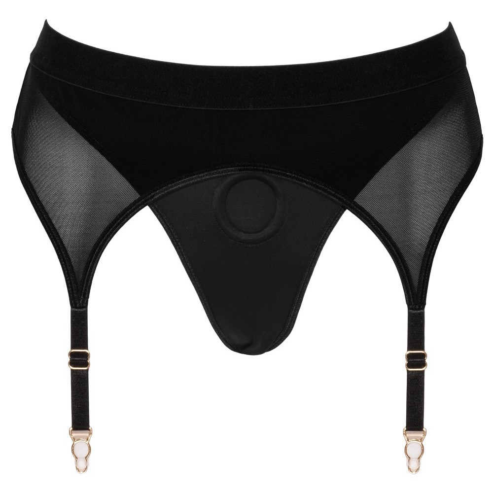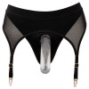 Black strap-on thong from Bad Kitty made of soft microfibre combined with a suspender belt made of soft powernet. The thong is double-layered at the front and has an opening as well as a carefully integrated stretchable ring (Ã 3.5 cm) for inserting a dildo/vibrator with a suction base. The suspenders are adjustable to fit.