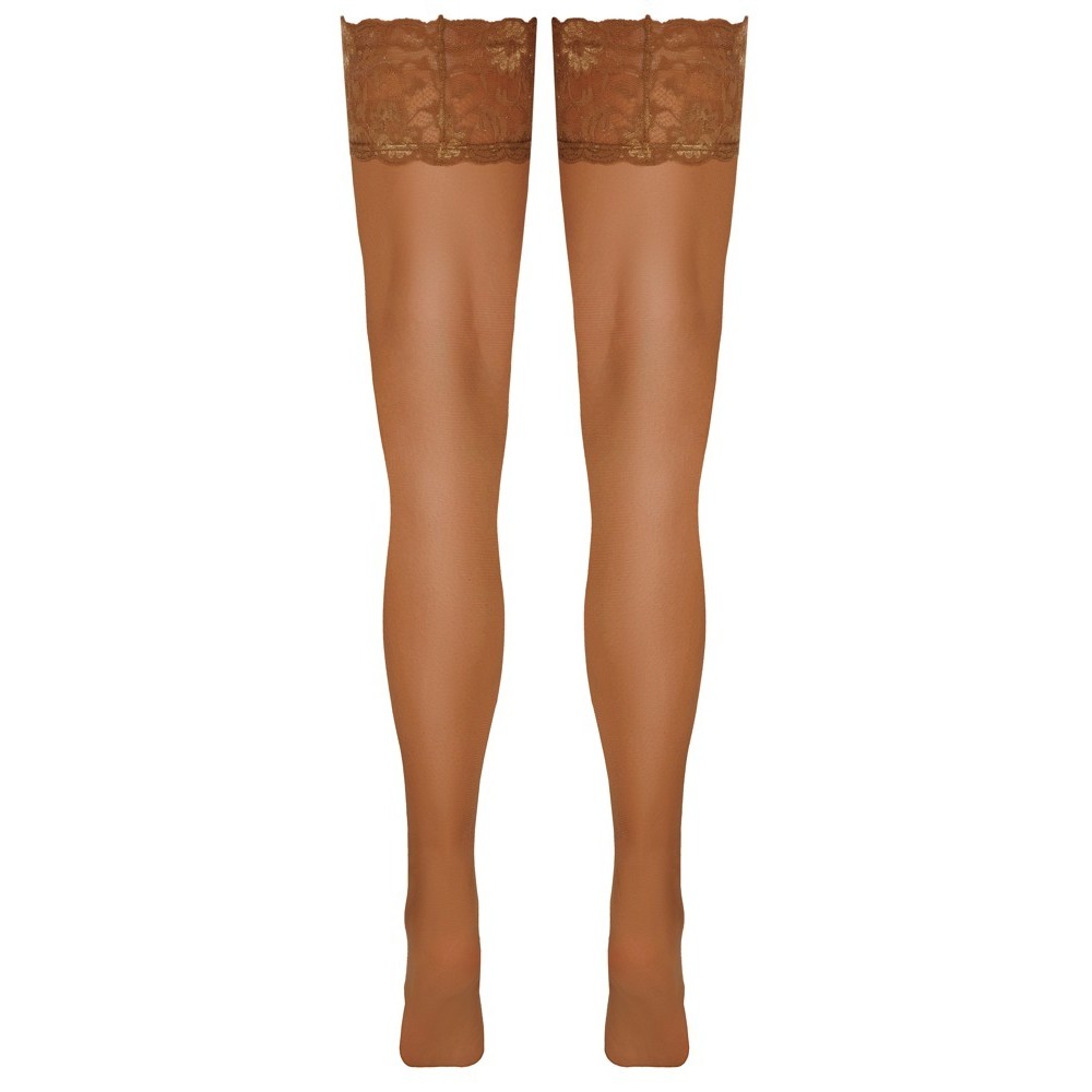 Lightweight, skin-tone hold-up stockings by Cottelli LEGWARE, with a 9 cm wide lace trim. Silicone-reinforced inner band for a non-slip fit and excellent support. 20 denier. Oeko-Tex certified. Lace designs are subject to change.