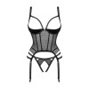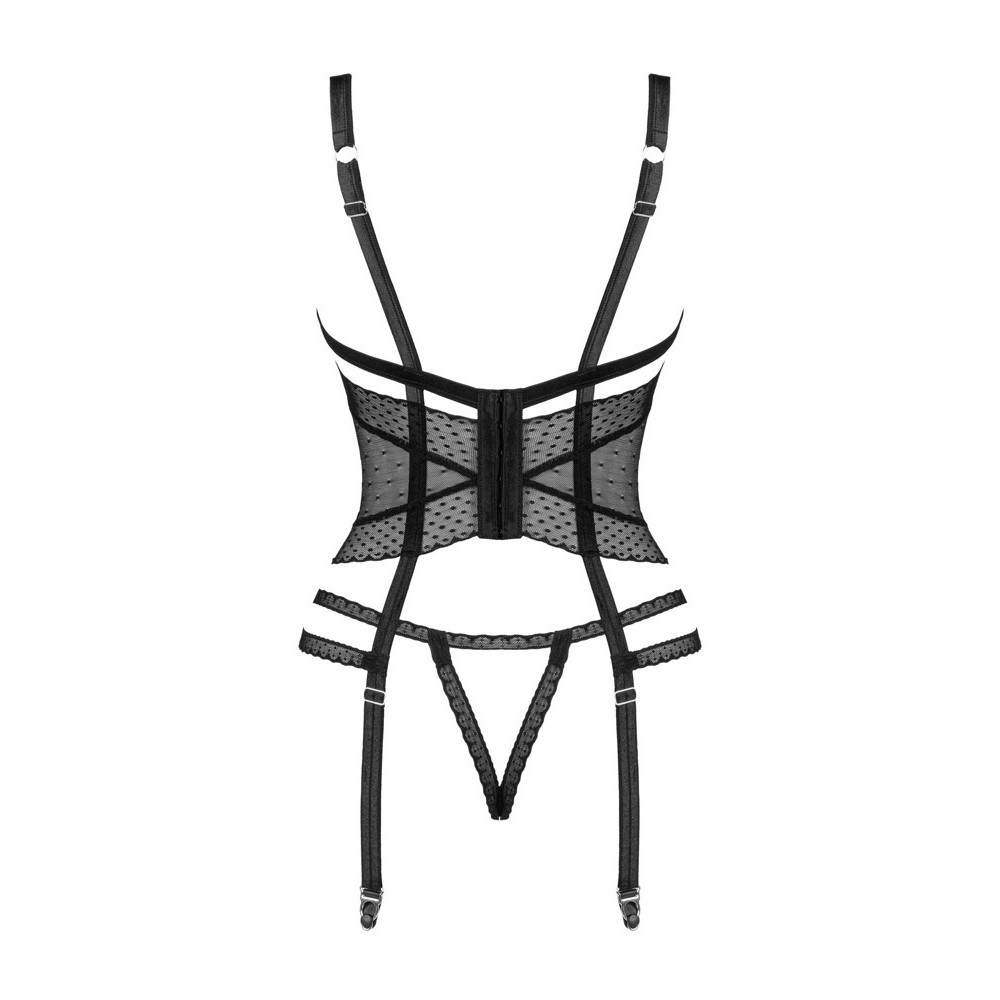 The black Lanelia corset combines sexy translucent mesh with an open-cut bra, adjustable straps and garter straps, a silver pendant on the bust and a hook fastening at the back. Includes a thong with an open crotch for an even more provocative effect and stretchy, pleasant-to-the-touch material.