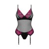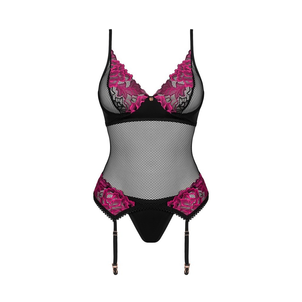 The Rosenty set by Obsessive includes a corset with suspenders and a thong. Made of soft black stretch fabric with subtle pink lace at the neckline and hips, the top has underwired cups and a small decorative element between them, as well as an adjustable hook fastening at the lower back. The straps and suspender straps are adjustable, and the opaque thong elegantly matches the corset.
