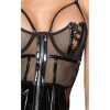 Dress with semi-transparent bodice with stripes, shaping bones, adjustable vinyl straps and decorative straps. The short, wide skirt in shiny vinyl completes the sexy look. Elegant details include embroidery on the cups, decorative vinyl stripes and a full-length zip at the front, ensuring a perfect and provocative fit.