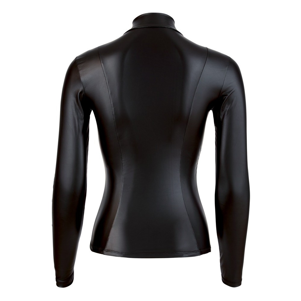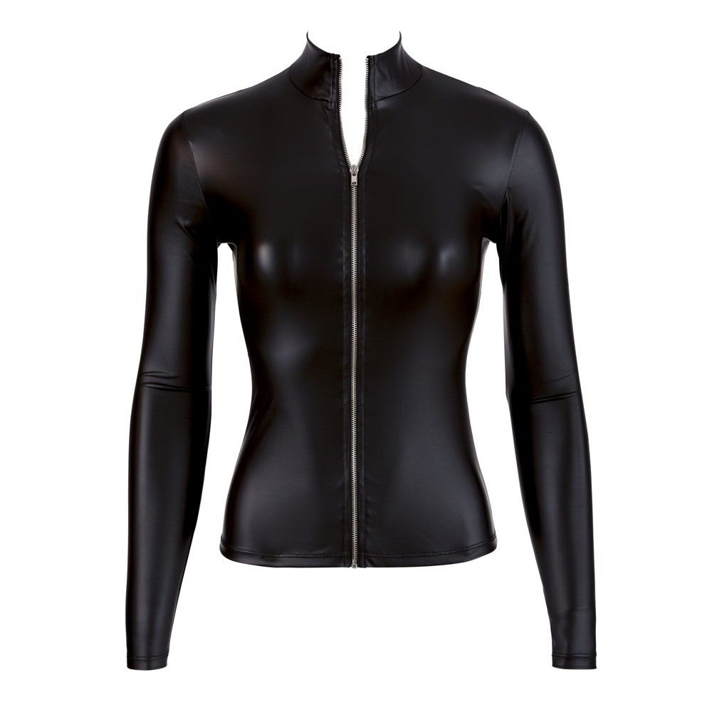 What man doesn't appreciate sensual curves? This black top enhances the female form without revealing too much. With a high neckline, small stand-up collar and long sleeves, this top with a shiny matte finish is anything but boring, being skin-tight and fitted at the waist.