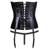 The corset is made of shiny black vinyl, is sensual and fitted, and has seductive details and removable straps.