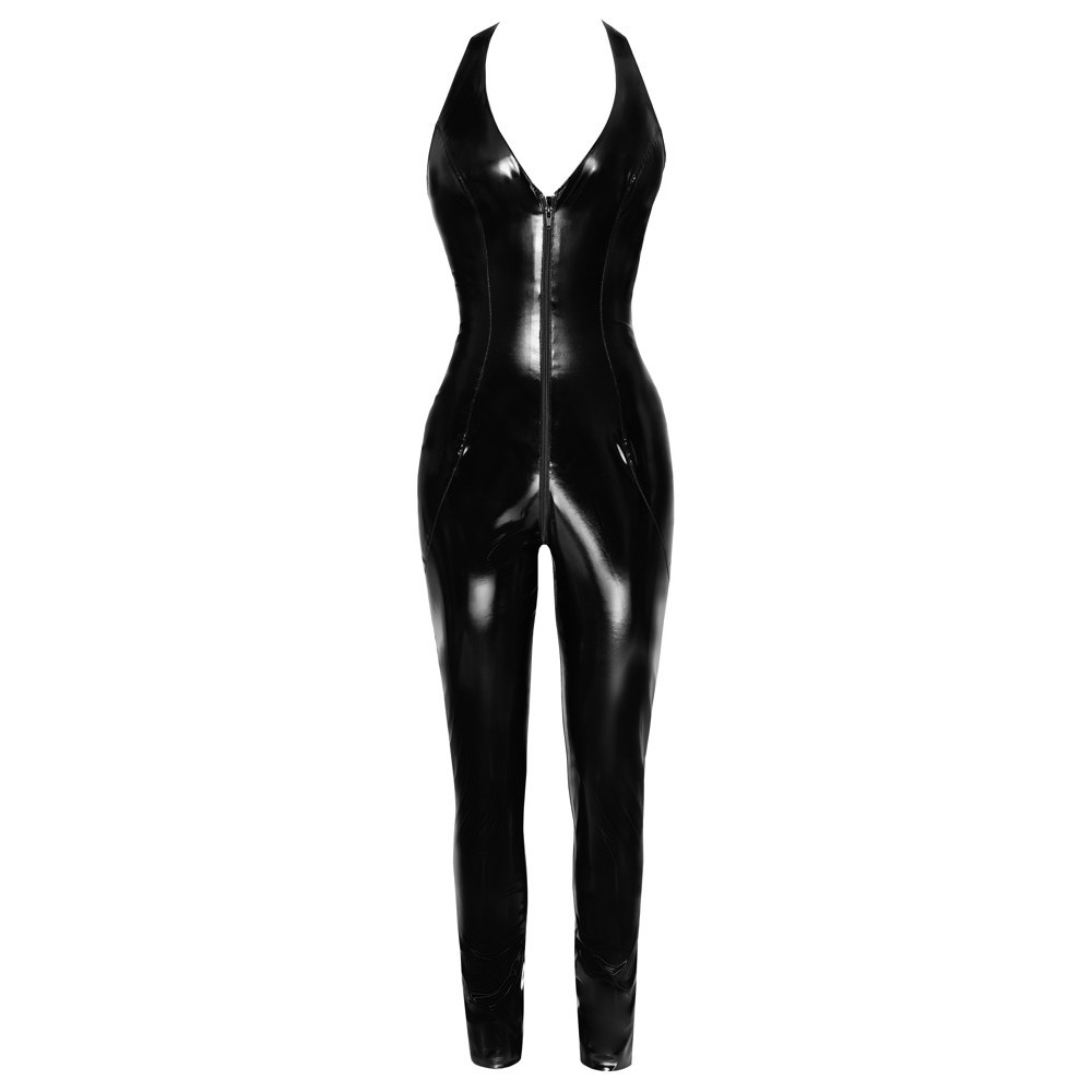 Sleeveless jumpsuit by Black Level, made entirely of shiny black vinyl, with a half-high satin collar adjustable by a tie. The tight fit seductively shapes the body, with long, fitted legs that taper elegantly at the bottom. The highlight is the practical and erotic two-way zip, which starts at the neckline, runs through the crotch and ends at the top of the buttocks, and can be opened quickly from both ends.