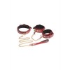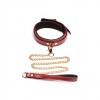 Bondage set in burgundy and gold PU leather, with handcuffs, collar, leash and adjustable chains.