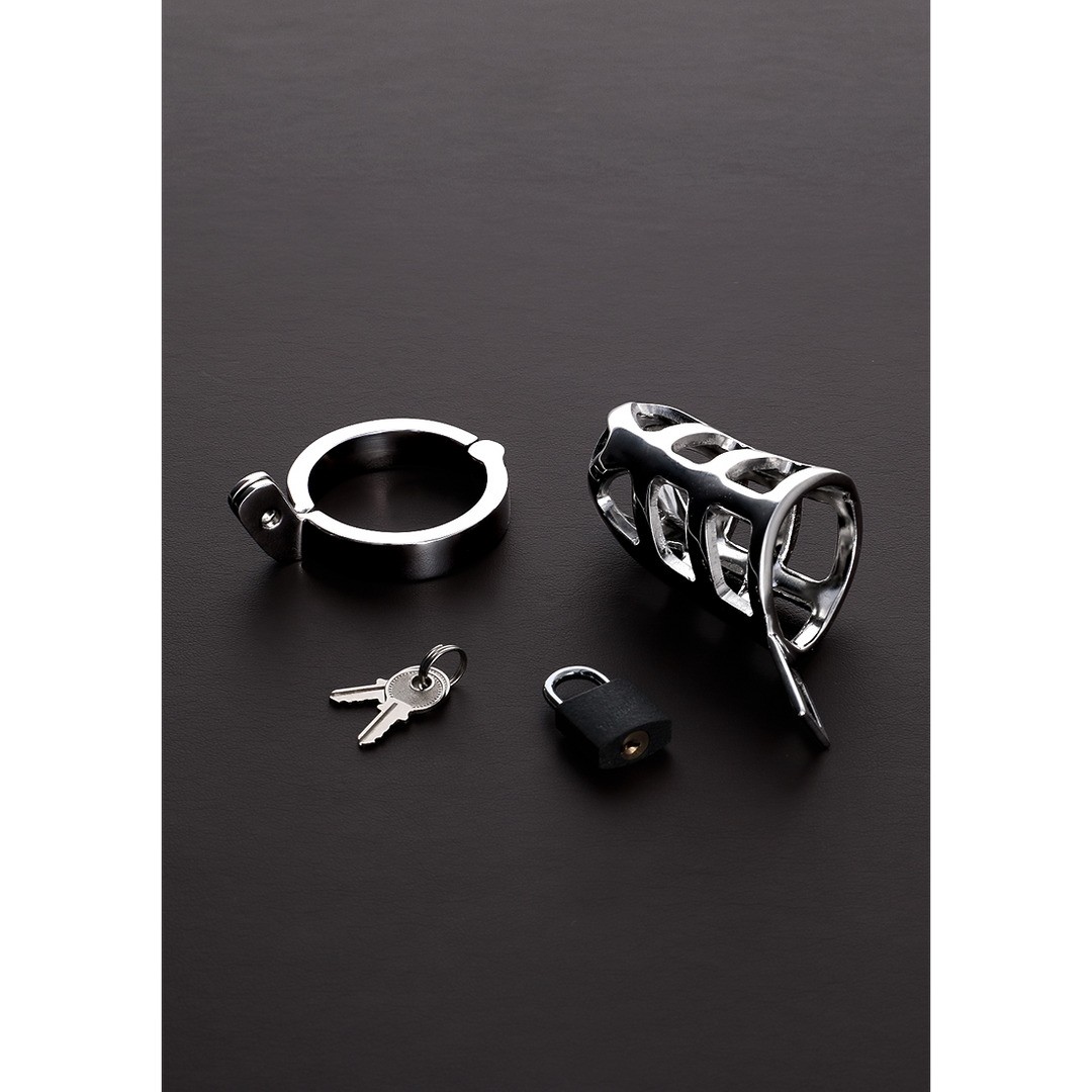 Stainless steel chastity cage, sturdy and comfortable, ideal for BDSM games.