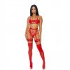 The mesh lingerie set includes a bra with underwires and contrast mesh and vinyl, featuring a cage design with a strappy rim, as well as a matching thong and garter belt