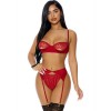 Lingerie set in cut-out lace with underwired bra, garter belt and thong, presented in a box.