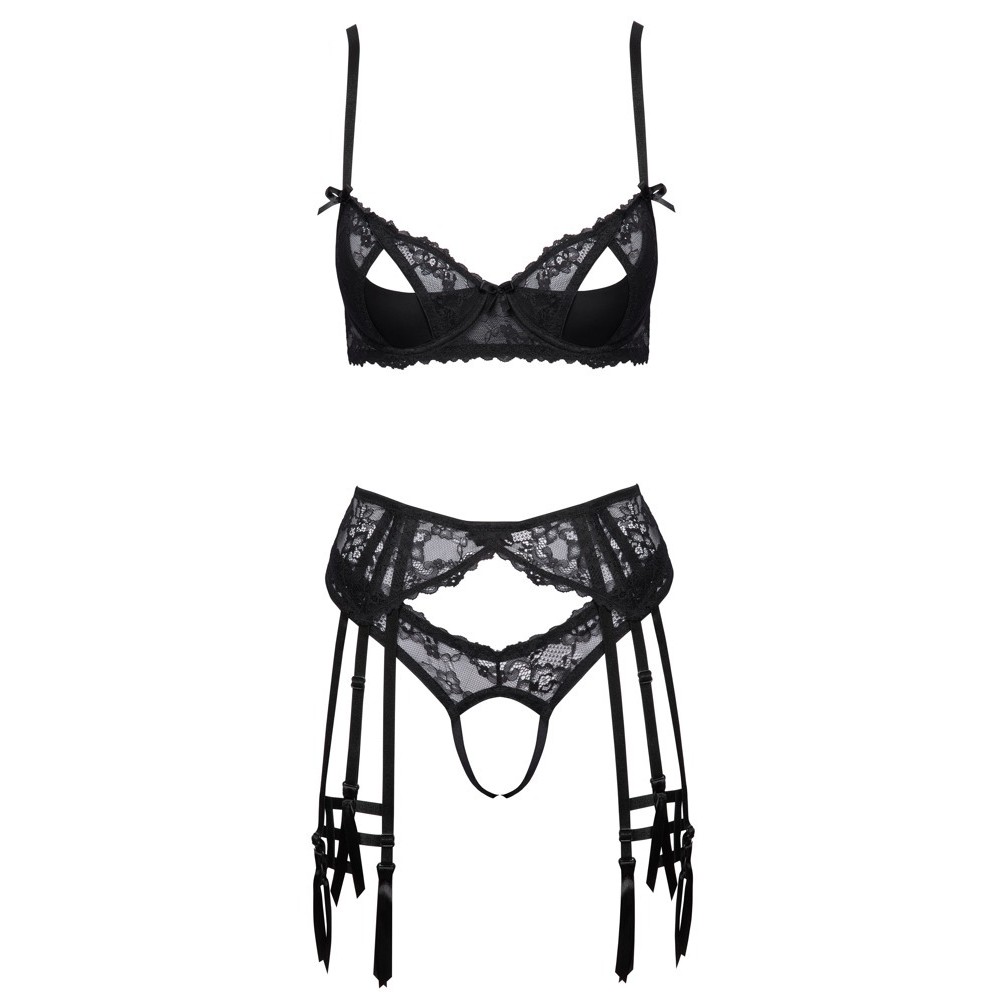 The black set from Cottelli LINGERIE includes an underwired bra, garter belt, thong and elegant garters. It is made of soft, delicate and elastic lace, while the garters are made of soft elastic straps.