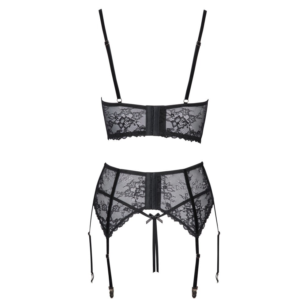 A deep-cut bra, garter belt and crotchless thong combine to form an elegant and erotic set from Cottelli LINGERIE. All pieces are made of soft, delicate and stretchy black lace, with velvet straps and silver ring details.