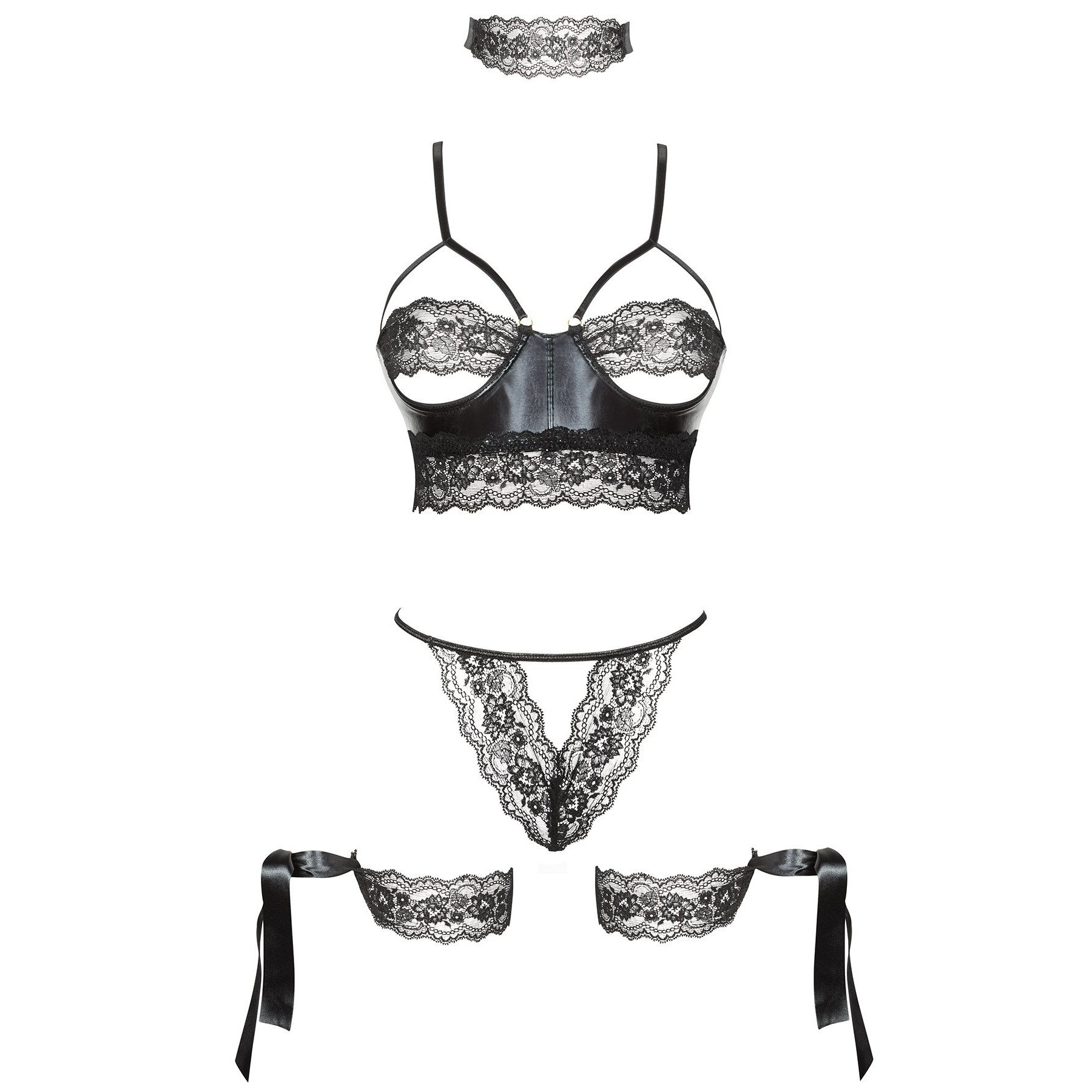 Sexy set consisting of five parts. Original cut of sexy bra made from lace and elastic, glossy material. Back lacing. Complete with thong, eye band and wrist straps.