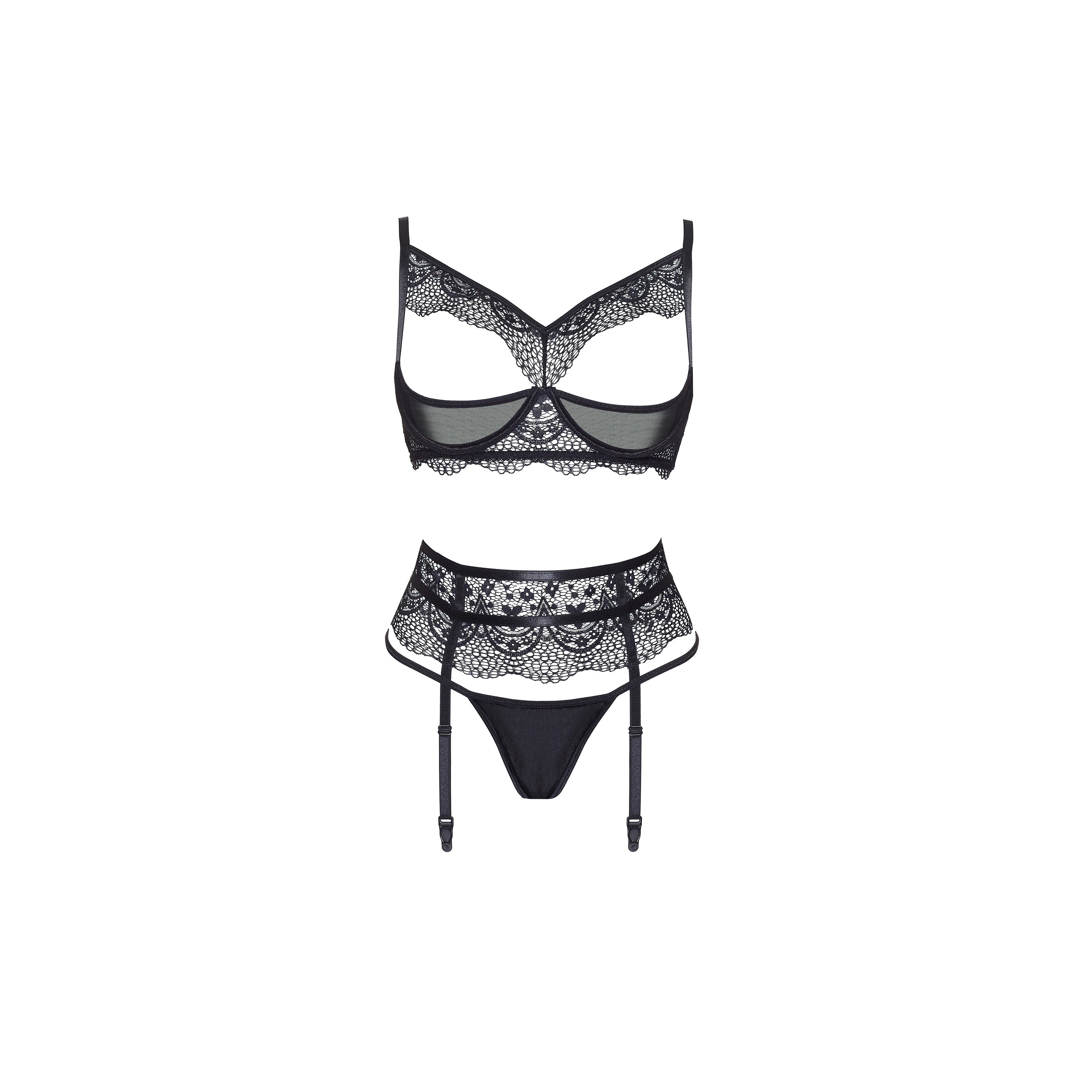 Classic, but at the same time very sexy three-piece black underwear set. Open bra made from lace and tulle with underwires. An eye-catching garter belt fastened with hooks.