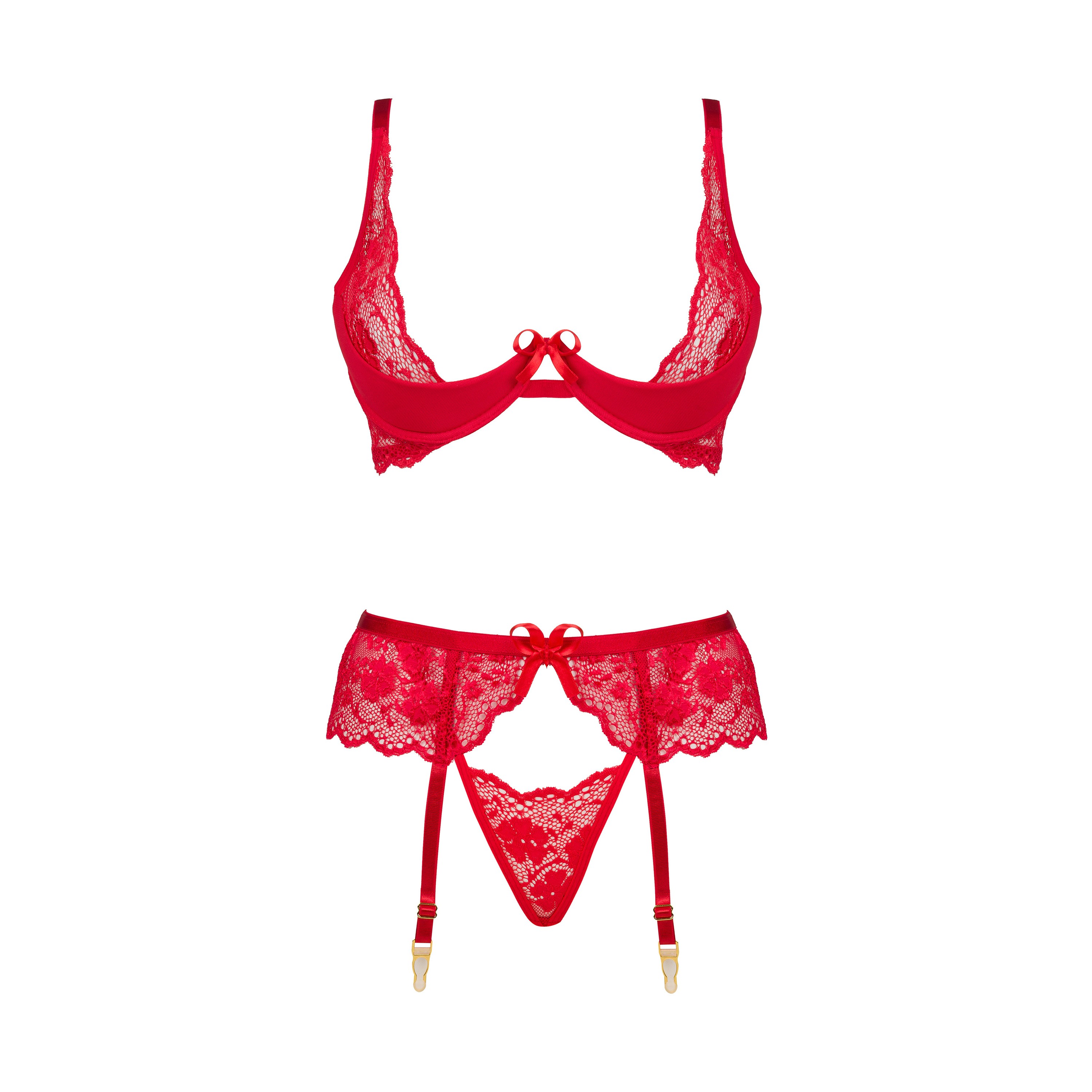 A classic lingerie set in red, consisting of a bra, panties, and a garter belt.